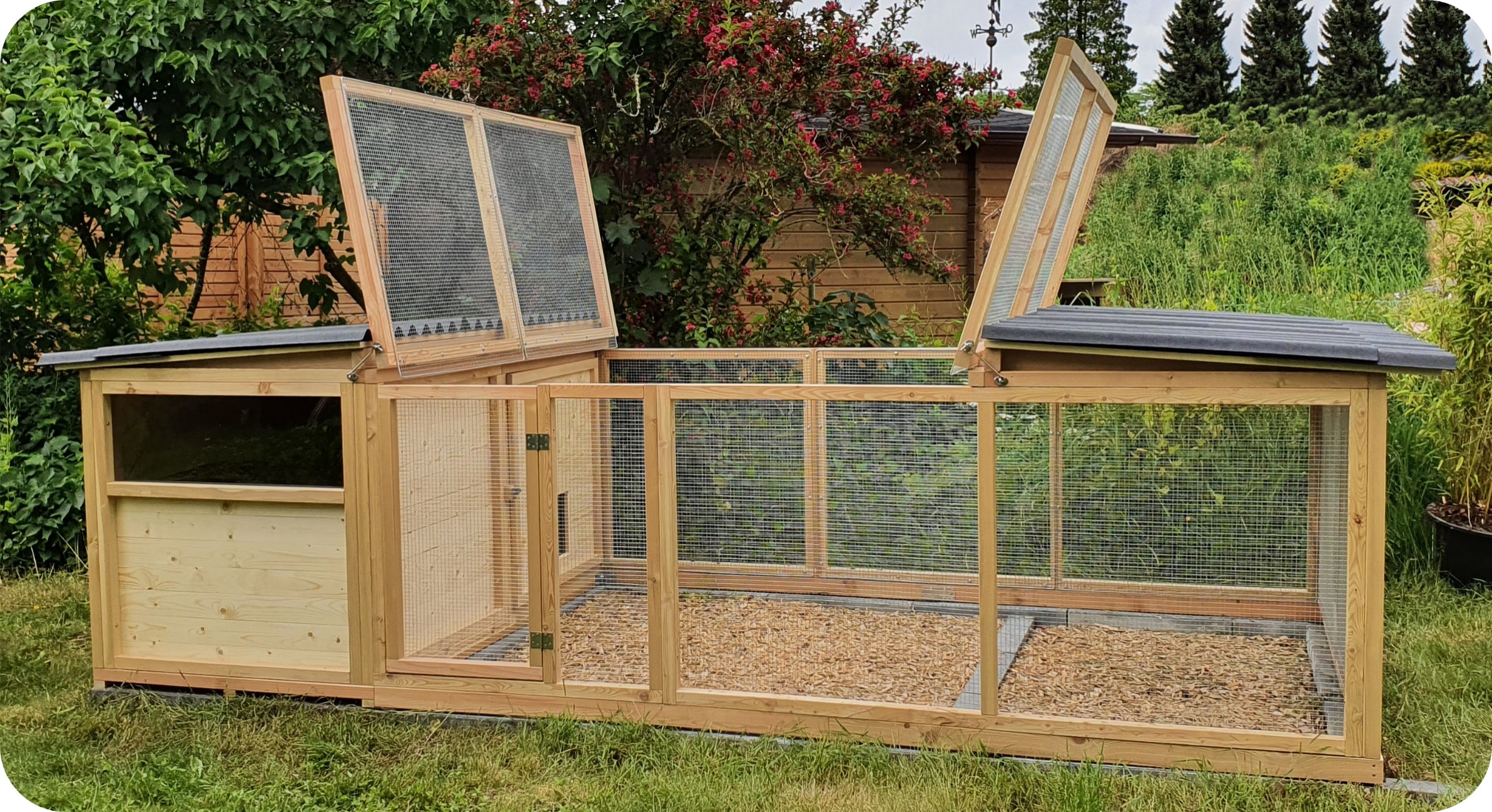 Die 1 Meter hohen Gehege bieten den Tieren viel Platz, um ihrem natürlichen Bewegungsdrang nachzukommen. Kaninchen haben zudem genug Höhe für Sprünge. Das Klappdach ermöglicht einen bequemen Zugang, um Zeit mit den Tieren zu verbringen und das Gehege zu reinigen. Kinder können sich auch bei geschlossenem Dach ohne Probleme im Gehege aufhalten.