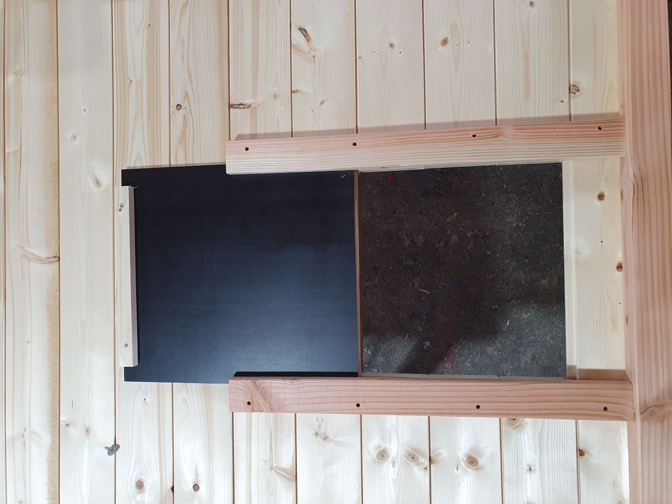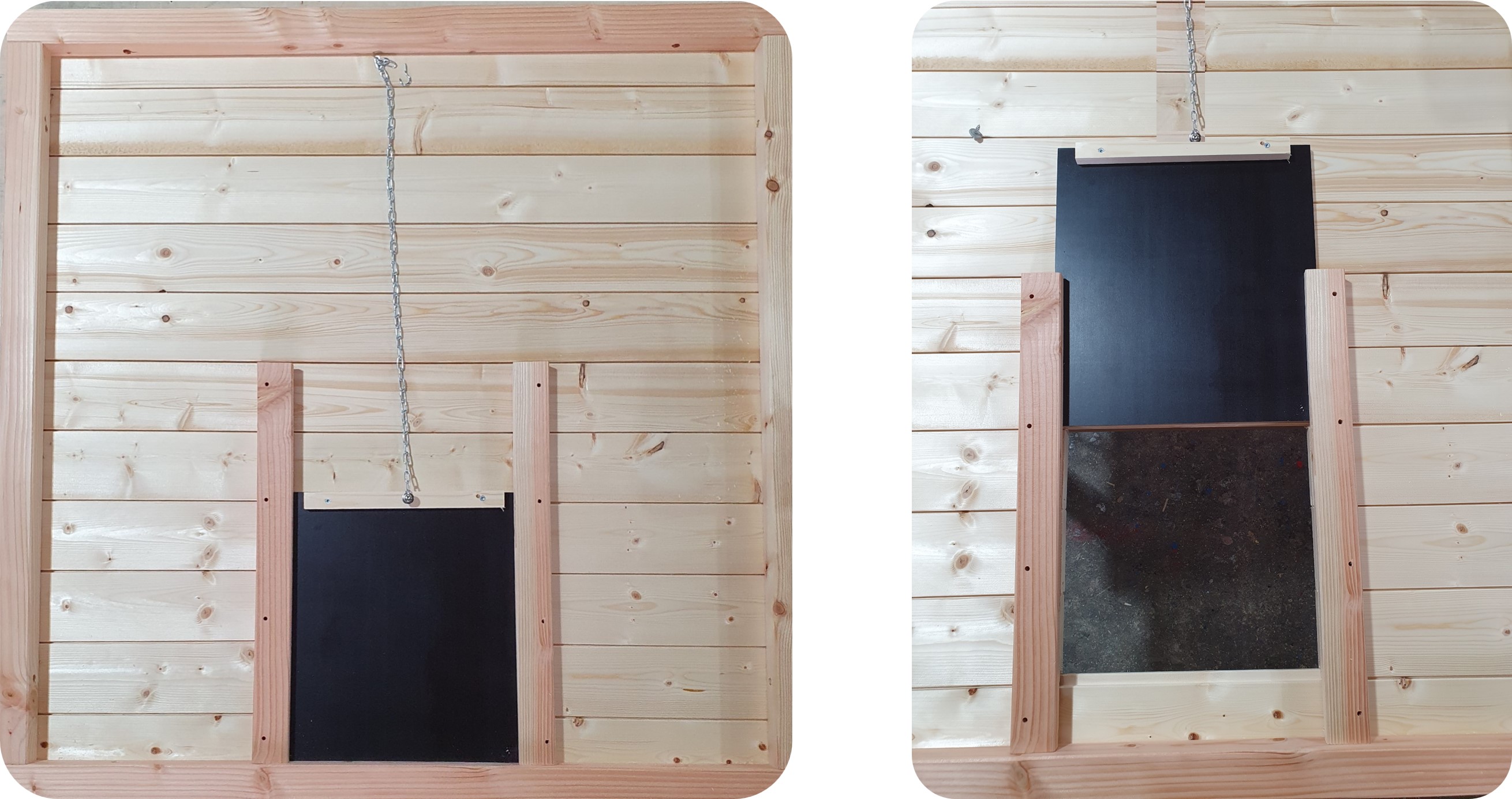 Für das Auslaufloch bieten wir eine Schiebe-Klappe zum Verschließen an. Möchtest du das Schutzhaus oder Gehege reinigen, kannst du durch Schließen der Klappe die Tiere aus einem der beiden Bereiche ausschließen.